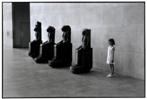 This is one of the earliest photographs in the exhibition. Taken in 1949 at the Metropolitan Museum, it implies that it is not the visitor who is observing the artwork, but the other way around. This humorous perspective contrasts with the conventional and intimidating appearance of the museum. We can almost hear the resigned visitor’s footsteps receding, echoing in a sacred, museum-like silence.